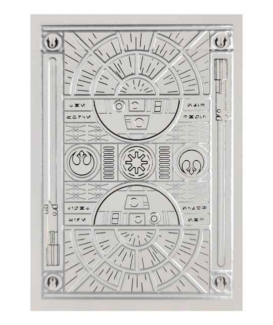 Cartile de joc Star Wars Light Side Silver Edition White au un design superb si calitate premium, asa cum ne-a obisnuit Theory11. In plus, reusesc sa aduca lumea Star Wars mai aproape de noi. Un pachet de neratat in colectie!Aceasta versiune, Light Side ii au in centru pe Luke Skywalker, sabia sa, R2-D2, luptatori din flora Rebela. Cutia este embosata si cu insertii metalice, cartile de curte surprind imaginile caracterelor iconice: Rey, Leia Organa, Han Solo, LukeSkywalker.