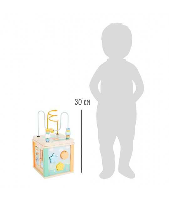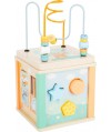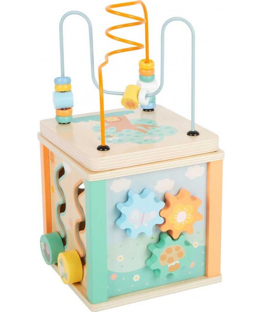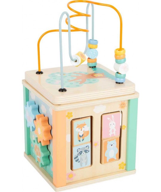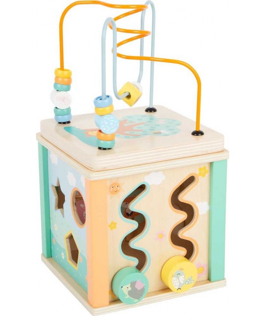 Stivati, impingeti, bateti, rotiti! Jucabil din cinci laturi, acest cub motor din lemn promite chiar si celor mai mici copii joc divers si distractiv. Un labirint de margele, un joc de sortare, un joc de montare si impingere a formei si unelte promoveaza recunoasterea culorii si a formei si abilitatile motorii fine. Culorile pastelate, motivele dragute ale animalelor si detaliile jucause fac din acest cub de activitate motorie un punct de atractie absolut in gradinita. Punctul culminant: capacul este detasabil si poate fi depozitat cu capul in jos in cub, astfel incat cubul motor poate fi pus deoparte pentru a economisi spatiu dupa joc.