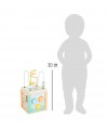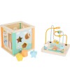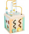 Stivuiti, impingeti, bateti, rotiti! Copilul se poate juca pe 5 laturi. Acest cub motor din lemn promite chiar si celor mai mici copii un joc divers si distractiv. Un labirint de margele, un joc de sortare, un joc de montare si impingere a formei si unelte promoveaza recunoasterea culorii si a formei si abilitatile motorii fine.